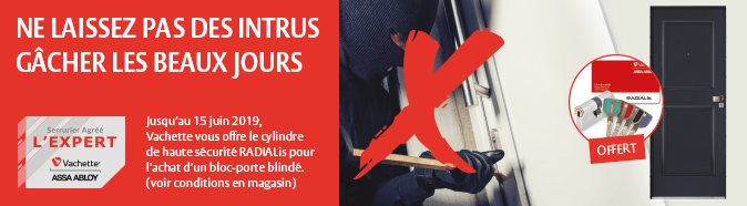 Jusqu’au 15 juin 2019, SOS CLES SERVICES votre serrurier agréé l'Expert Vachette à Toulon vous offre le cylindre de haute sécurité RADIALis pour l’achat d’un bloc-porte blindé Vachette.